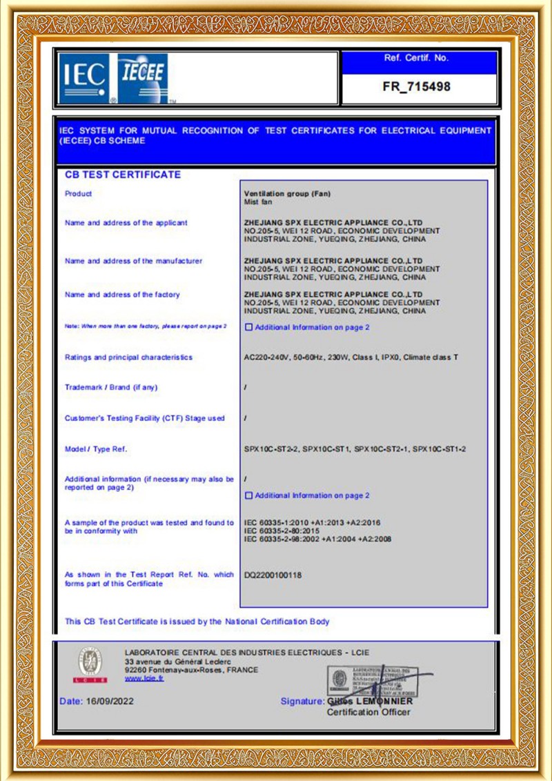 Az SPX megszerezte a kínai kötelező tanúsítványt (CCC), a CE tanúsítványt és az ISO9001 szabványos tanúsítványt, valamint néhány különböző tanúsítványt a különböző termékekhez, amelyek megfelelnek az ügyfelek igényeinek.